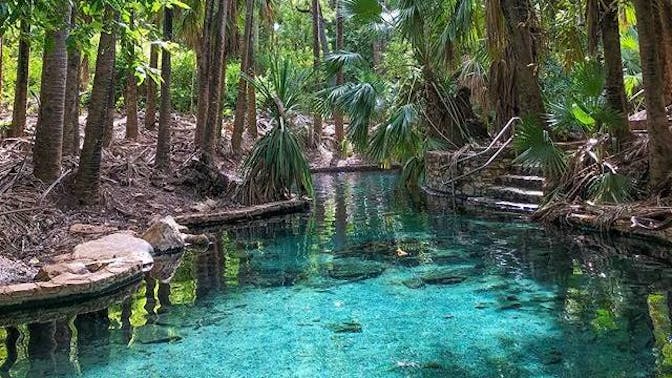 🏊♀️ Swim in the pristine Mataranka Hot Springs — naturally heated to 34°C year-round (tip: bring a pool noodle so you can float through the springs!)