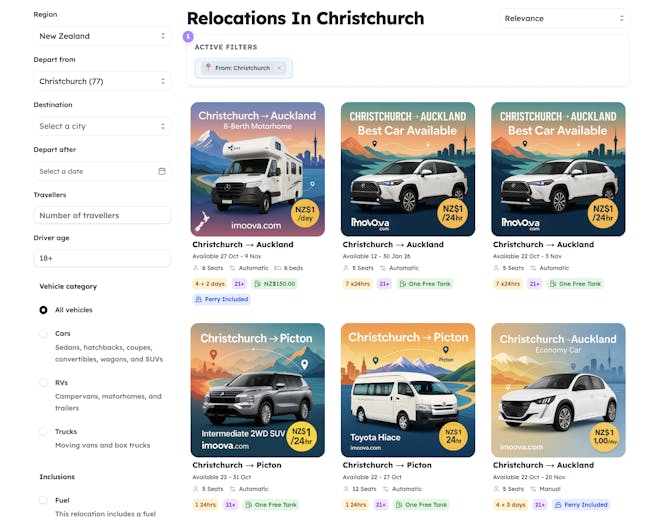 Imoova partners with leading rental companies that need vehicles relocated across New Zealand. Travellers get an unbeatable deal — relocation cars, motorhomes, and campervans starting from just $1/day, often with fuel or ferry costs included.